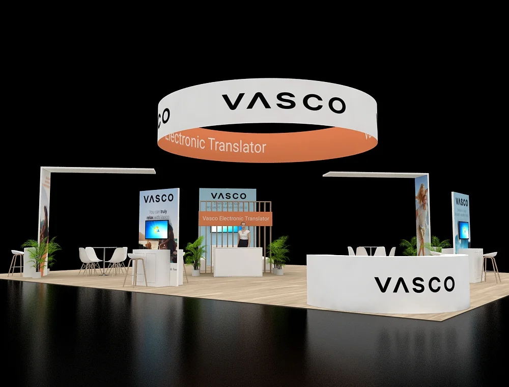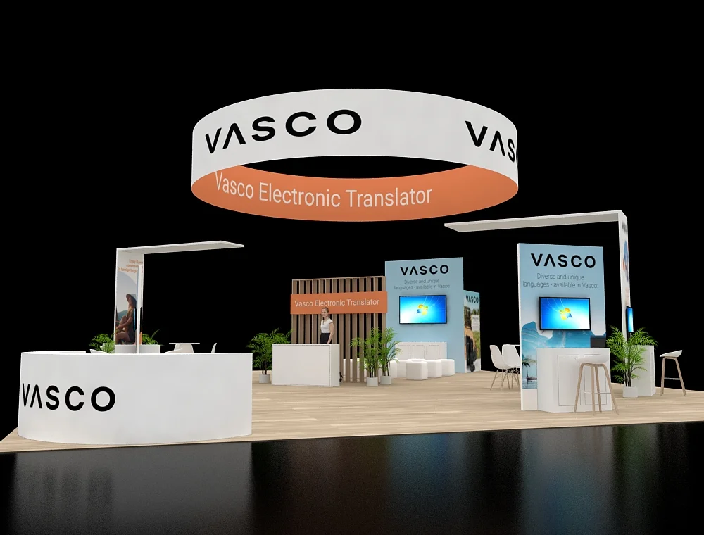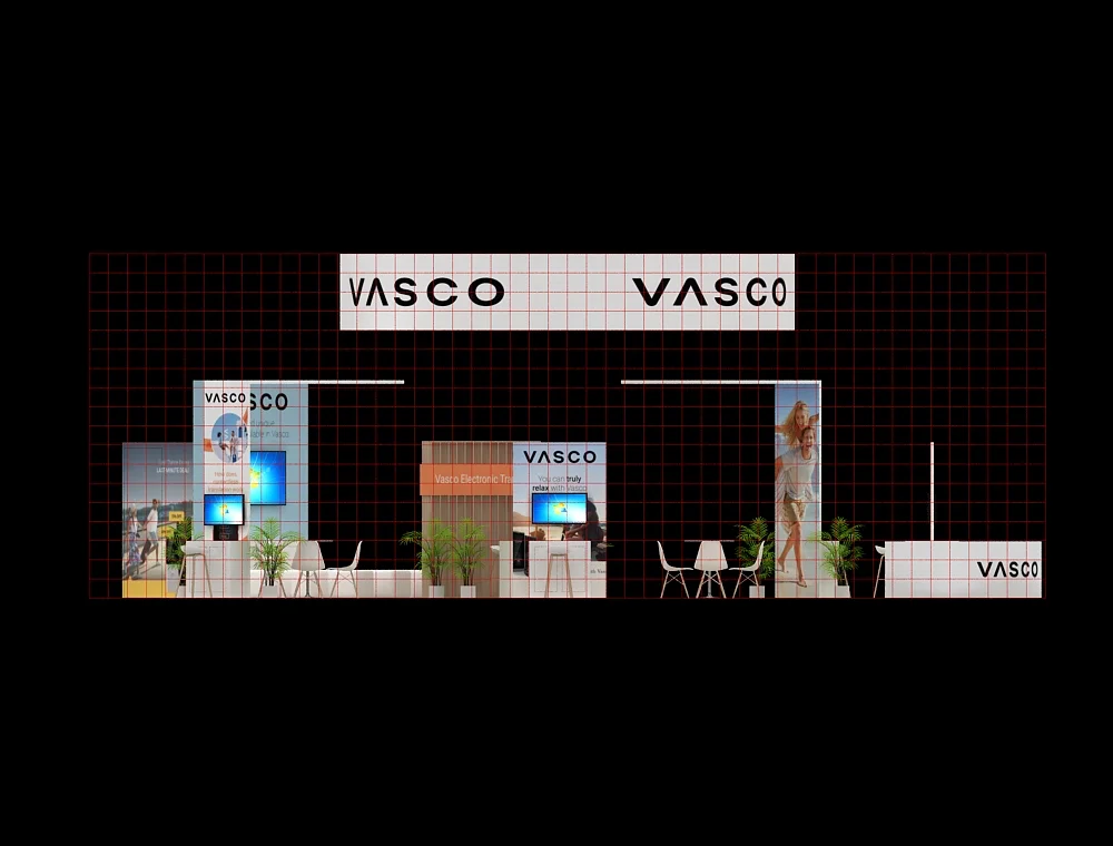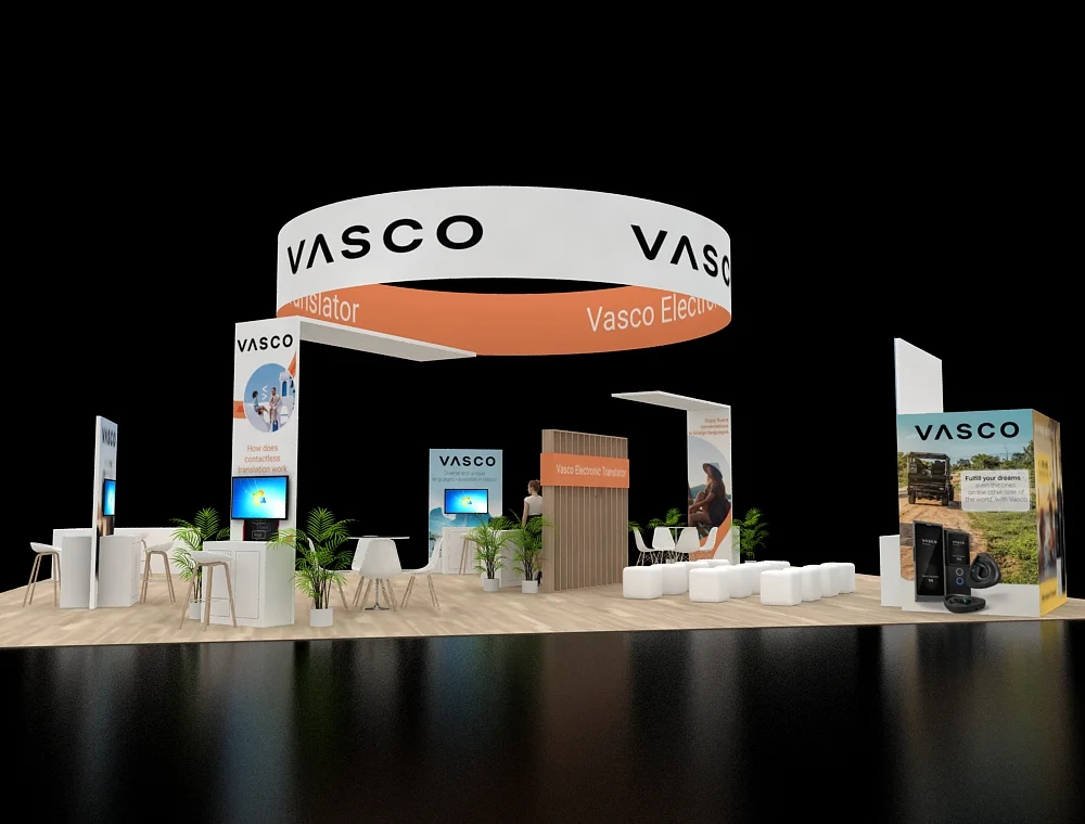 This 40x50 layout features a prominent circular overhead halo that defines the space and ensures long-distance visibility. The design utilizes twin reception counters at the front, complemented by two dedicated interactive demo stations. A central service desk sits against a slatted back wall, while open meeting areas and integrated greenery balance the modern, clean-lined structural aesthetic.