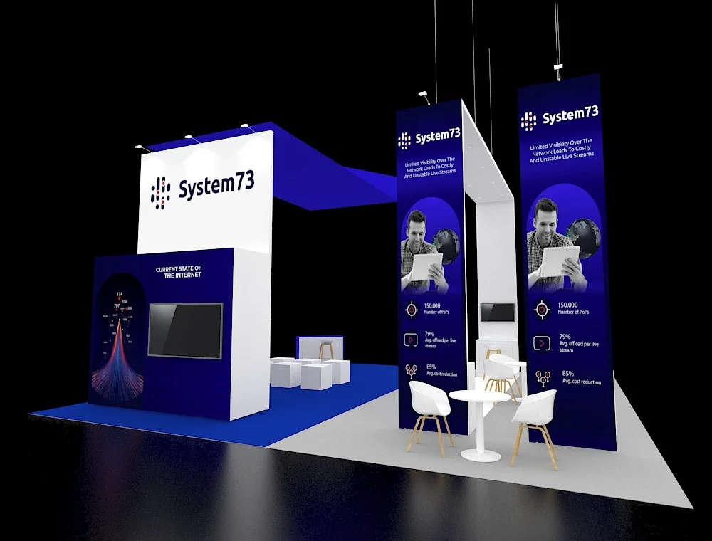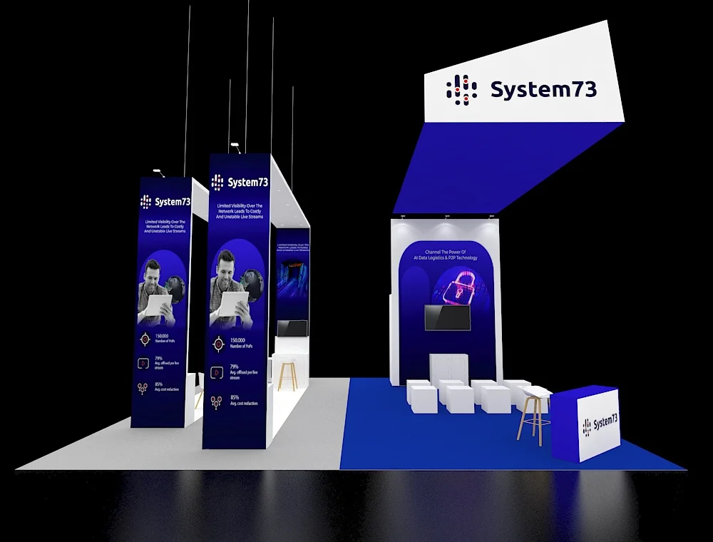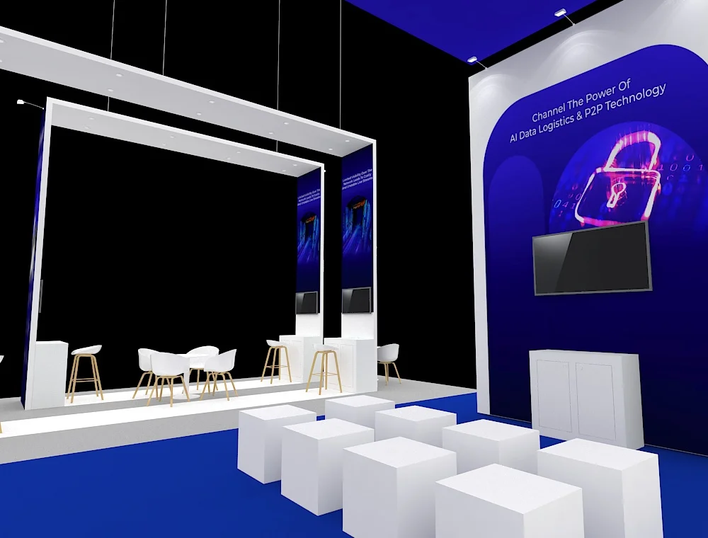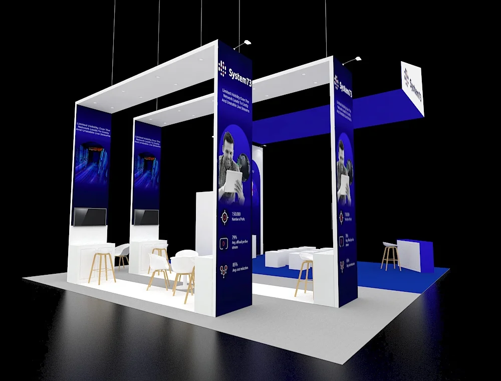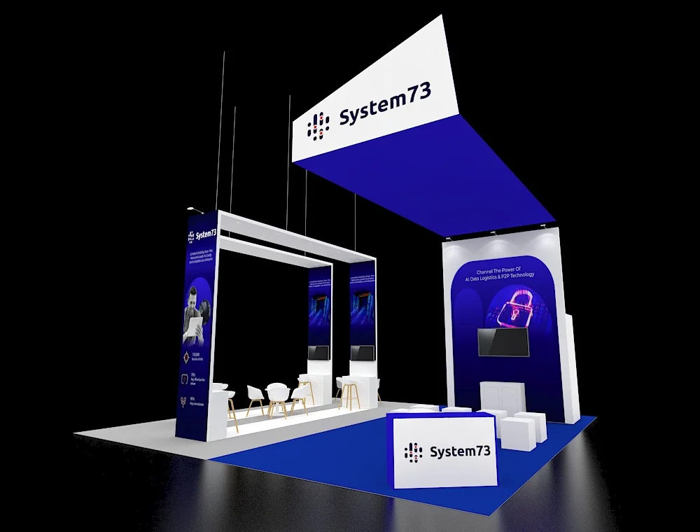 This 30x30 exhibit features a massive circular overhead banner that serves as a central focal point, anchored by four matching corner pavilions. High-top seating and vertical pylons with digital screens are integrated into each corner station's wooden slat pergolas. To facilitate fluid visitor movement and professional engagement, the open floor plan uses a centralized reception hub and light wood textures.